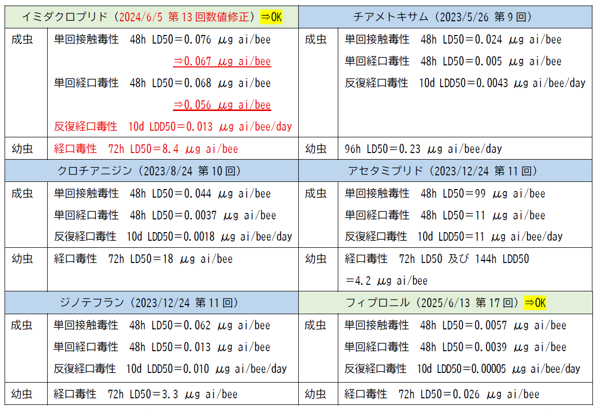 2024年6月5日にイミダクロプリドの曝露影響に用いる数値(毒性指標値)が修正され、その値に基づいた影響評価の結果、2025年3月5日(第16回)に「申請された使用方法や被害防止方法に基づき使用される限りにおいて、ミツバチの群の維持に支障を及ぼすおそれはない」との結論に至りました。同じくフィプロニルも、2025年6月13日(第17回)に以下の毒性指標値が了承され、値に基づく評価の結果、使用によってミツバチに問題なしとされました。その他の原体は下記の数値に基づき、曝露量推計のため継続審議中です(③)。