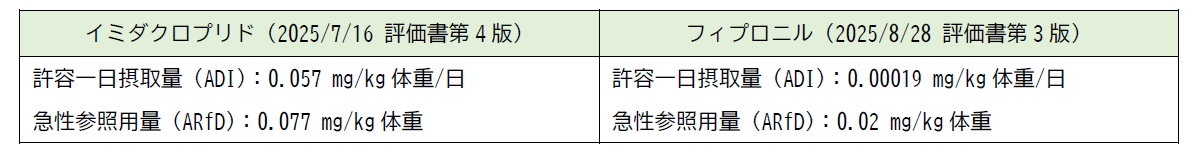 2025年7月16日にイミダクロプリド、8月28日にフィプロニルの評価書を決定し、ADI、ARfDを農水省(⑥)、消費者庁(⑨)宛てに通知しました。その他の原体は審議継続中です。