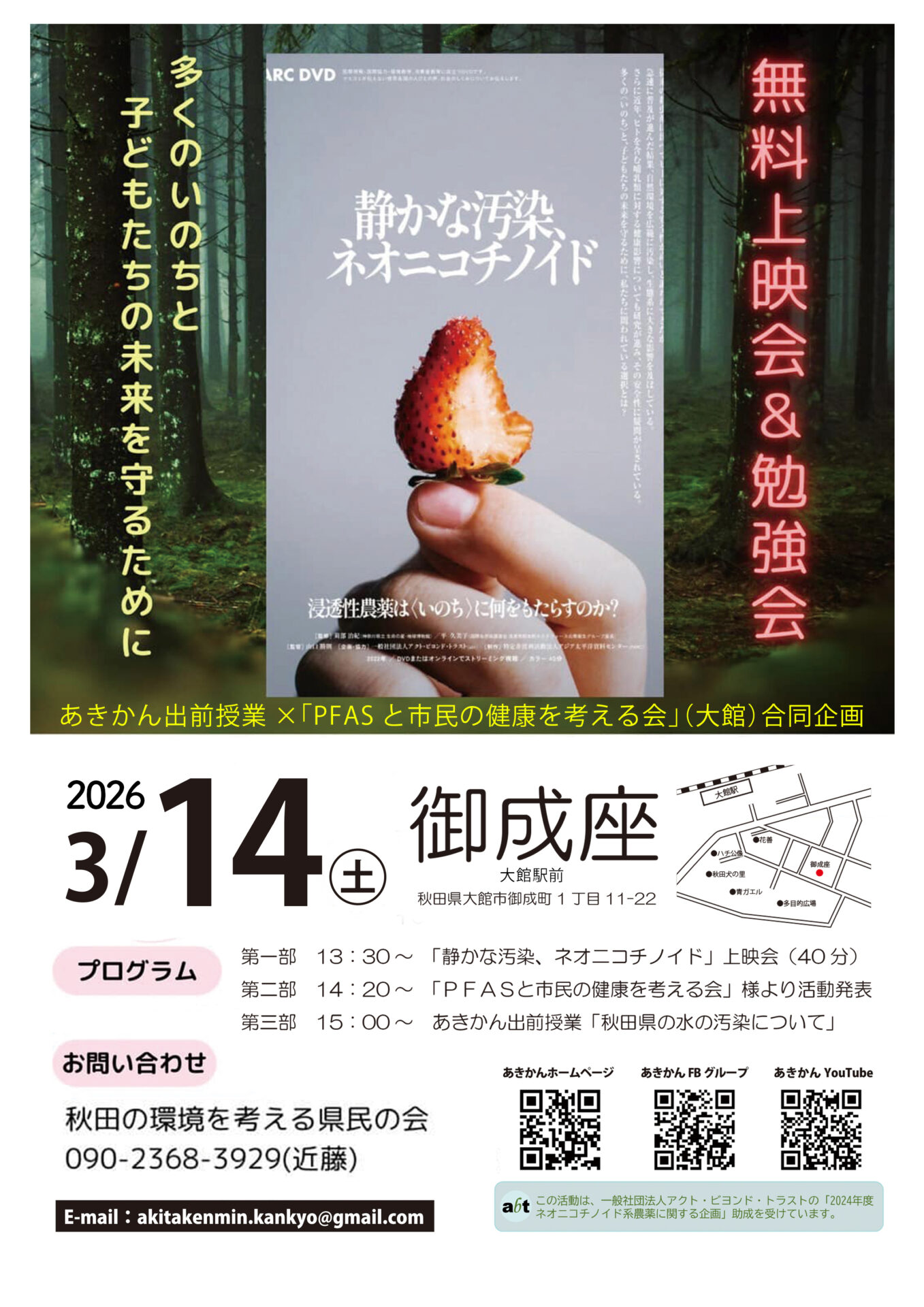 3月14日(土)に『静かな汚染ネオニコチノイド』上映会&勉強会を秋田県大館市「御成座」で、大館市市民団体「PFASと市民の健康を考える会」と「秋田の環境を考える県民の会」合同企画として開催します。